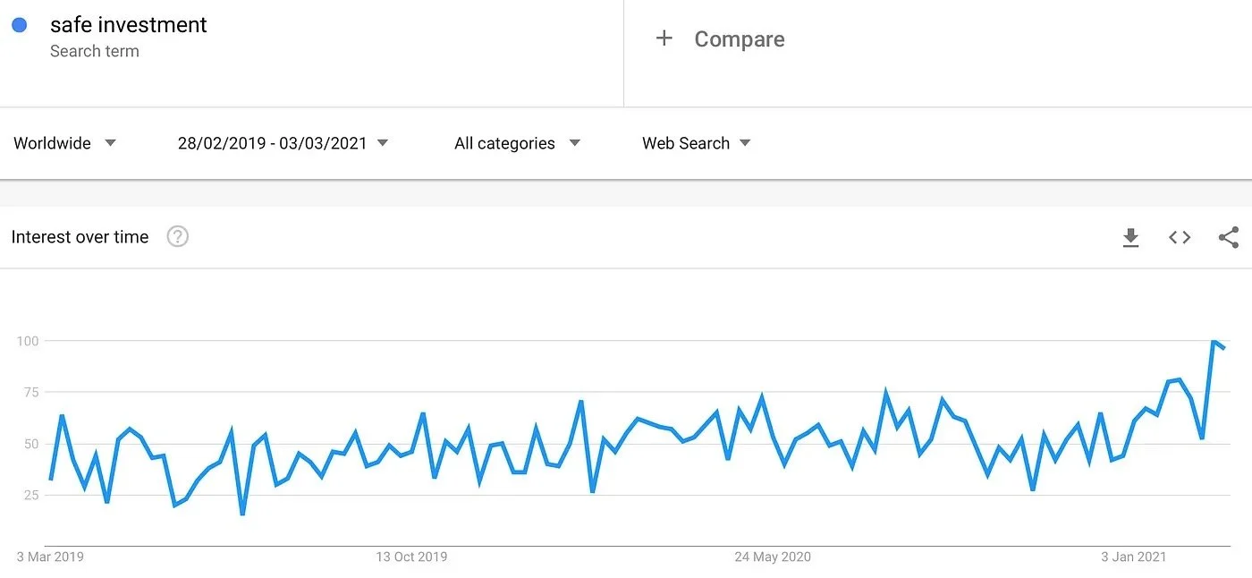 Google search volumes over time for “safe investment”. Created on 03/03/2021 by Author.