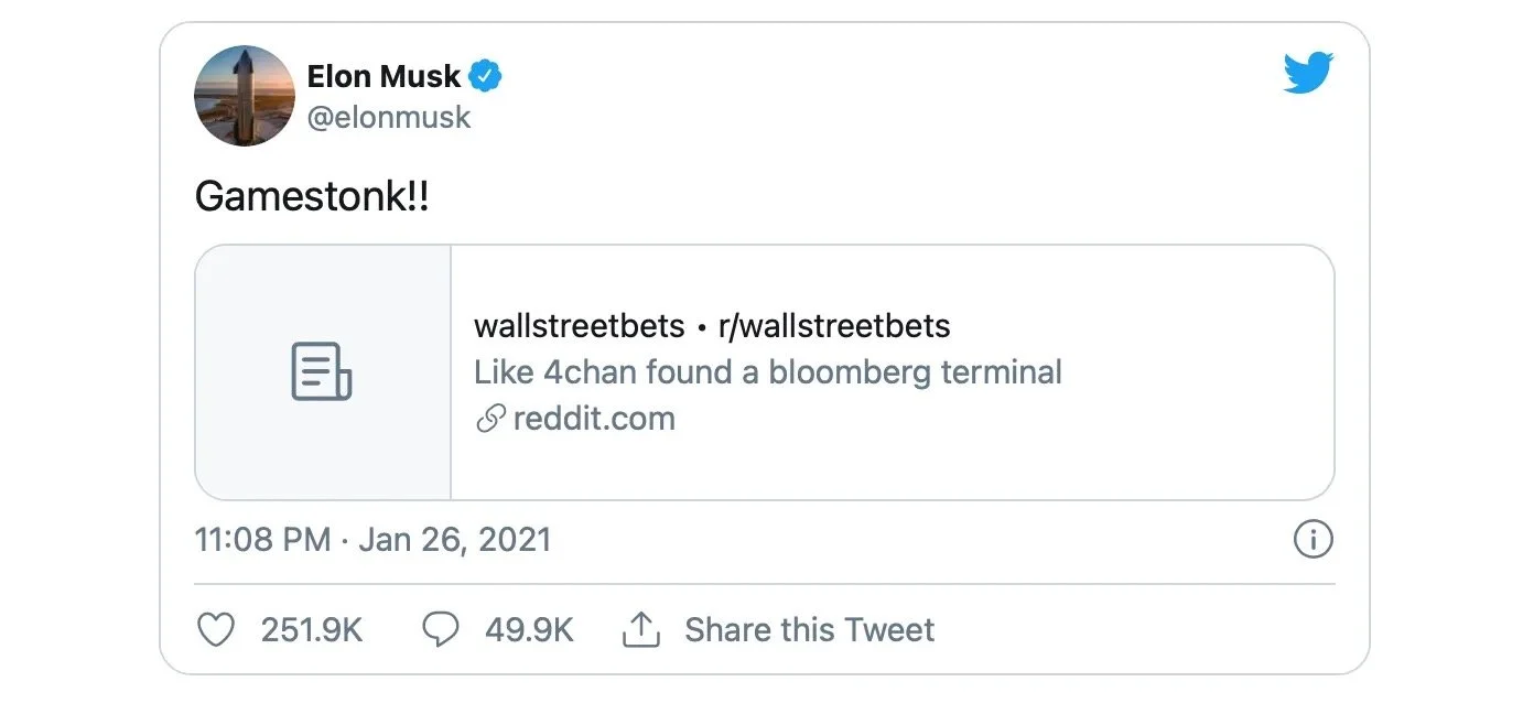 Even Elon Musk got in on the fun, a link to the WallStreetBets thread on GameStop. This brought the GameStop saga to peak exposure, and resulted in a 100% increase in the share price during after-hours trading.