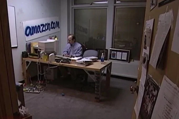 Jeff Bezos in his tiny office in 1999, with a spray-painted Amazon.com logo